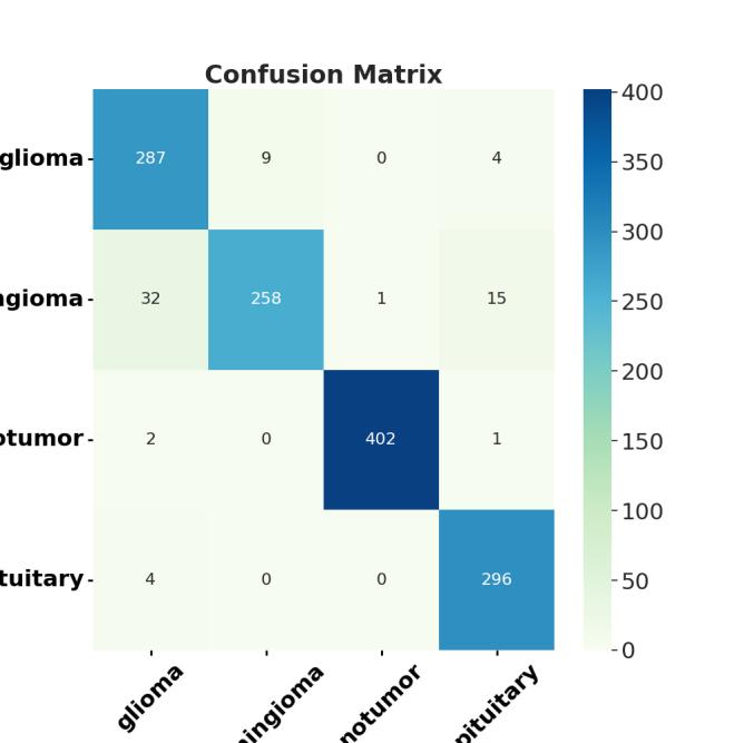 Two-dimensionalMRIimagesfromKagglewhichareresized toauniformdimensionof224×224×3arefedasinputtothe system. 5712 images were used for training and 1311 images were used for testing. Out of the four EfficientNet models, EfficientNet B3 provides higher accuracy in brain tumor classification task. EfficientNet B3 gives 98.8% training accuracy and 93.1% testing accuracy and outperforms all the other EfficientNet models. The least accurate was EfficientNet B0. This network model gives a low training accuracy score of 58.7% and a validation accuracy score of 27.5%. The accuracy and performance comparisonofvariousmodelsaregiveninTable1andTable 2.