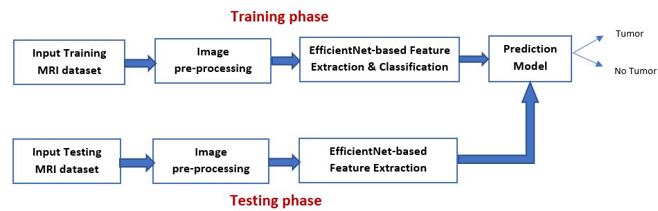 Inthisworktransferlearning-basedapproachforclassifying brainscanshasbeenemployed.EfficientNetmodelsareused here for automatic feature extraction and classification of brainfeatures Thebraintumordetectionsystemconsistsof two phases.One isthetrainingphaseand the other isthe testingphase.Inthetrainingphase,featureextractionand classification on the training data set are done to create a predictionmodel.Inthetestingphase,testdataisfedtothe predictionmodeltodeterminewhetherthepersonhasthe tumorornot.Themainstepsinvolvedinbothphasesarei) inputtheMRIdataii)preprocessingiii)featureextraction andclassification.