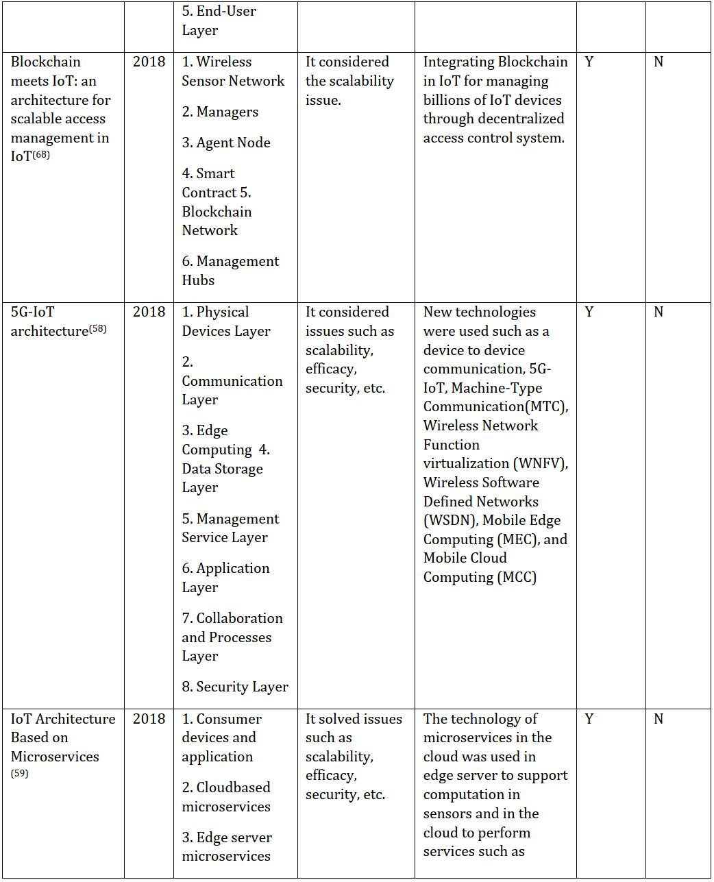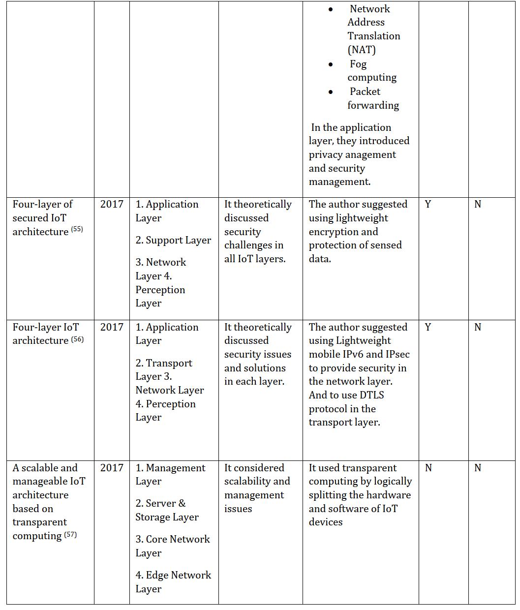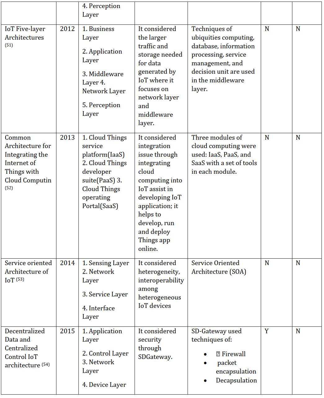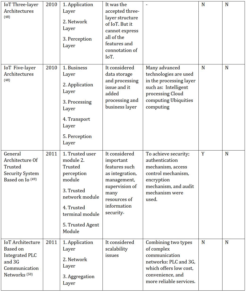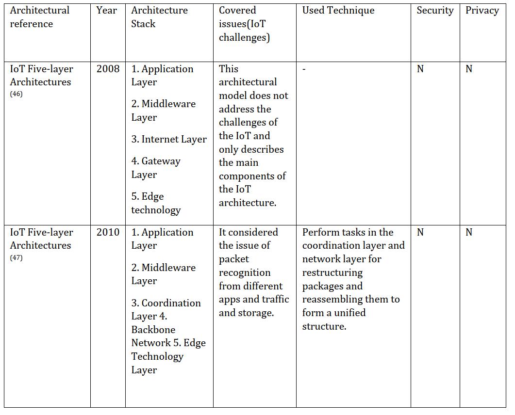 application and the year of use and release. These different architectural models are often shared in the sensor, network, and application layers. There is no fixed and consensus theory about the main IoT architecture (45), but by referring to the table below, you can get acquaintedwiththedifferentmodelsofarchitecturesused intheIoT.