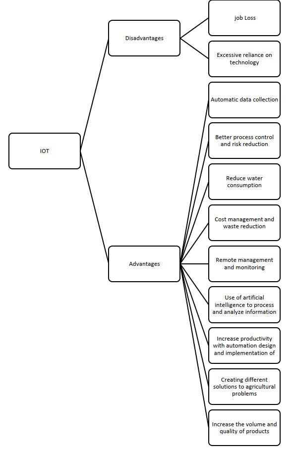 In addition to increasing crops, water consumption and soil resources are saved. Among the advantages of smart greenhouses can be the possibility of cultivation in some uncultivable areas, continuous production of crops throughout the year without affecting the existing restrictions, increasing yields, reducing disturbance and damage to cultivation by animals, improving the quality andquantityofcropsandincreasingTheprofitoffarmers pointed out. Insmartgreenhouses,all stagesof irrigation, fertilization, spraying, pH adjustment, salinity, control of climatic parameters such as soil moisture, relative humidity,temperature,light intensity,carbondioxideand carbonmonoxidearedoneautomatically. Fig -2:AdvantagesanddisadvantagesofIoT