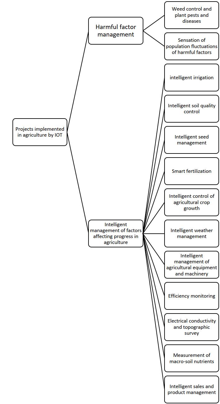 Using the Internet of Things and smartening, the activities of existing jobs in agriculture for manpower are eliminated and replaced by intelligent systems. Following the loss of jobs for manpower working in agriculture and greenhouses, new job opportunities will be created for designers and implementers of intelligent systems. Implementable plans and activities that can be implemented in the field of IoT in agriculture can be divided into two categories, which have different parts, which we will describe in the following. In general, it can be said that these two categories are divided in terms of their impact on agricultural products and the environment.
