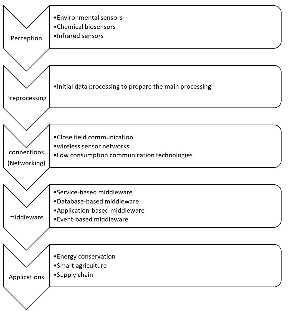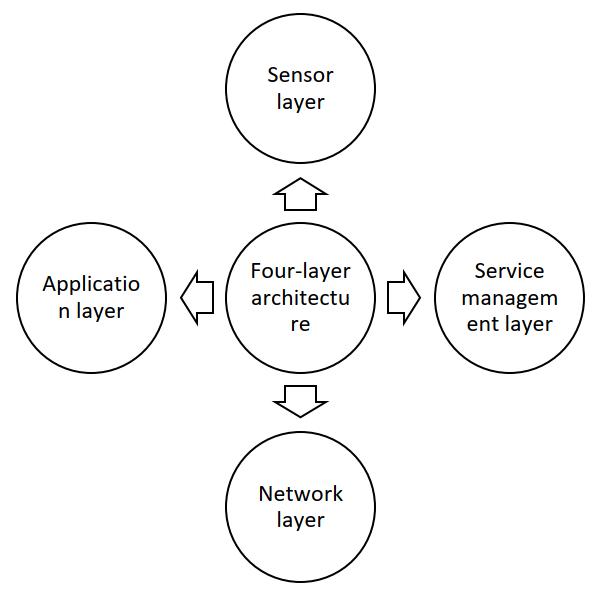 This architecture consists of three layers: sensor, architecture, has sensor, network, and application layers. Inadditiontothesethreelayers,thisarchitecturealsohas another layer, the addition of which to the three-layer architecture layers is more supportive. This layer is located between the application layer and the network, knownastheservicemanagementlayer.Thetechnologies used in this new layer include cloud computing, smart computingandfogcomputing (63,64,65)