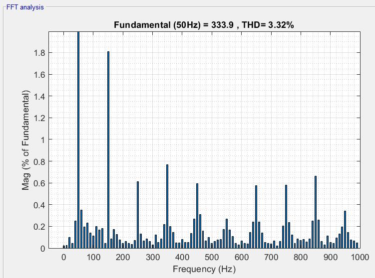 The obtained THD is 3.36 percent theoretically. he fast Fourier transform (FFT Analysis) is used to calculate harmonic distortion in the Simulink model. FFT analysis is used to convert signals from the time domain to the frequency domain. The magnitude vs. frequency plot of theproposedmodalsignalsisgivenbytheFFTspectrum.