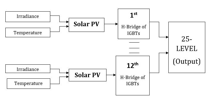 The most popular renewable energy source used to supplyelectricityissolarenergy.owingtotheappealing quality of solar energy. The suggested model includes a photovoltaic system with twelve independent solar PV arrays that uses to obtained a 25-level H-bridge multilevel inverter. To fulfill the maximum demand of load twelve standalone PV array is used Twelve hybrid bridges with a particular switching topology are used to convert the input dc voltage to an ac voltage with different levels on the output side. Switching losses can be reduced by employing IGBT. Figure 3.1 is a block diagramoftheproposedmodelofthe25-levelHMLI.The suggested 25-level hybrid cascaded multilevel inverter's output is seen in Figure 3.2.PWM controlled method is usedforswitchingtopologywithreferencesinewave. Fig- 3.1.BlockDiagramof25-LevelHMLI