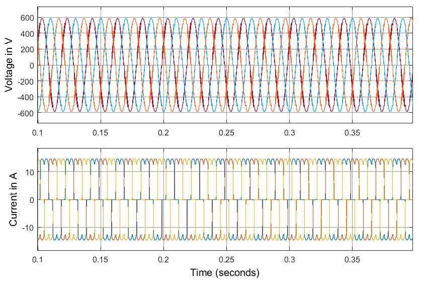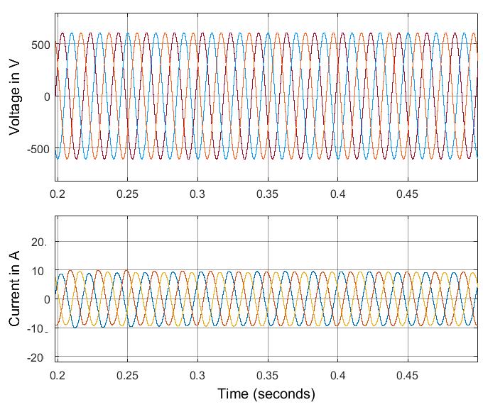 Fig. 7. Voltageandcurrentbothatgridsidefornon-linear loadingwithPV-D-STATCOM