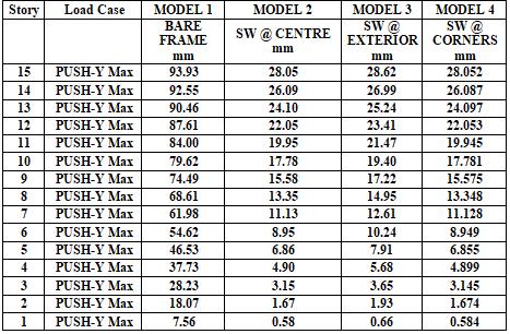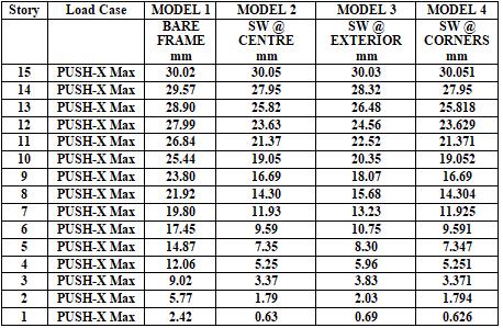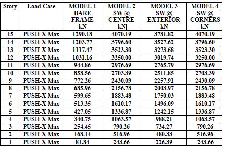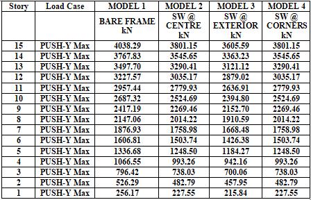 Allthetransitionalvaluesaretakenfrom thesoftwareand preparedaExcelsheetforStoryforces,storydisplacement ,storystiffnessandthenaturaltimeperiodwereobservedby comparingallthemodelsforcesareinincreasinginrest3 modelsbecauseofshearwall bythatcomingtoapointthe stiffnessisincreasinganddisplacementisdecreasingasper our models the base shear is more in the model 2 and displacementisless.