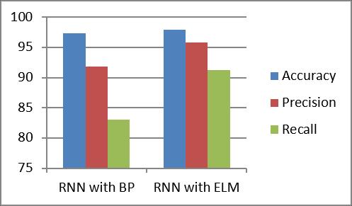 We trained the model using Keras library by specifying adamoptimizer.Backpropagationalgorithmisbydefaulta part of Keras implementation of RNN. Cross entropy is used as the loss function and the metrics used is accuracy with 100 epochs. An epoch is the number of input objects for which one iteration of training occur. Different combinations of epochs were given such as 50,100 and 150. 100 epochs yielded the best accuracy of all others. Execution measures, for example, exactness, accuracy and reviewaredeterminedforthetestdataset.Fortheinferior piece of our investigation, we hold the prepared RNN model and the component determination. Rather than applying the BP, we employ the ELM at this crossroads to anticipate the evaluate for the test dataset. We compute a similarpresentationmeasureslikeexactness,accuracyand review. The Table 1 represents the exhibition evaluate for ourdataset.