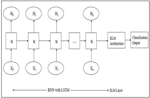 This sort of information requires an engineering which can store earlier data. For this prerequisite, RNN are the well suited design as they have LSTM which can store earlier data and give that to the progressive layers. Generally, a backpropagation system would be utilized, which feeds back the result to the information layer again to expand the precision. Our half and half design is displayed in the Fig. 2 underneath. We propose to involve ELM design in a various leveled manner in the wake of applying RNN for grouping issue and give a similar examination on how our RNN-ELM mixture and conventional RNN with BP observe for the information netherstudy.