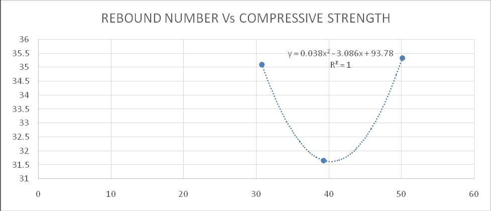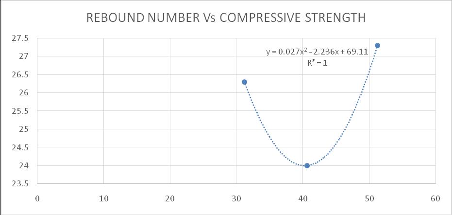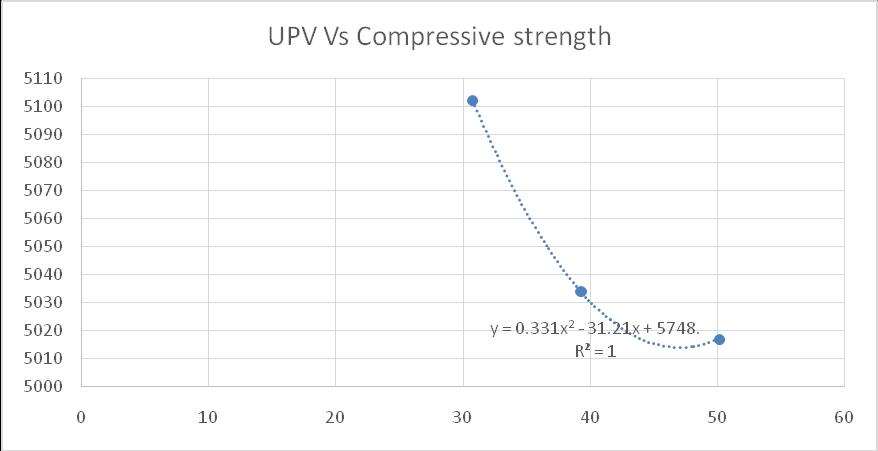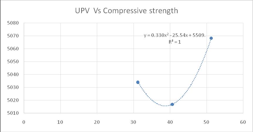 An attempt was made establish the relation between compressivestrength(MPa)andReboundhammertestand compressivestrengthwithUPV.Asitcanbeseenfromfig’s that there is direct correlation between compressive strength with UPV and Rebound hammer number. Polynomial regression analysis was performed and the resultisshowninFigure.Correlationbetweencompressive strengthwithReboundhammernumberandUPVshowedRsquared value of 1. Following equations are proposed for predictingthecompressivestrengthofconcrete.
