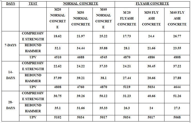 Table 4.1 Compressive Strength ,Rebound Hammer number, Ultasonic pulse velocity Result