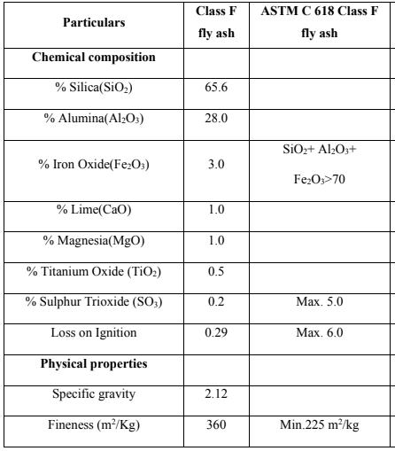 AccordingtoASTMC618(2003),ClassFflyashproduced fromRayalaseemaThermalPowerPlant(RTPP),Muddanur, A.P was used. The chemical and physical properties are presentedintheTable3.3
