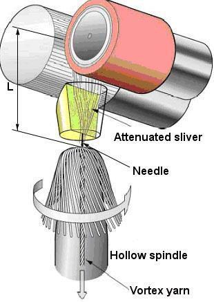 Vortexspinningisayarn-spinningtechniquethatemploysanairvortex.Thefibrescreatedbytheseairfluxeshaveadistinct structure,whichgivestheyarnawiderangeoffunctions.Vortexspinningusesafour-rolleraprondraftingmethodtodraught pulledcottonslivertotheappropriateyarncount(fineness) Thedraftedfibresarethendrawnintoanozzle,wheretheyare swirledaroundtheoutsideofahollowstationaryspindlebyahigh-speedairvortex.Thefibrescreatedbytheseairfluxes haveadistinctstructure,whichgivestheyarnawiderangeoffunctions.Sinceitispossibletoeliminatemoveableelements such as thespindle andtraveller in ring spinning orthe centrifugein rotor spinning, air-jet spinningsystems have been developed.