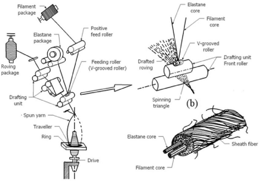 Undertensilestrain,theusualforcesexperiencedbythefibersincreasetheadhesiveforcesbetweenthem,preventingfibresfrom flyingorslippingpasteachother.Itistheprocessofdrawingoutrovingtotherequiredyarncount,twistingthefibreswitha rotatingspindle,andwindingtheyarn onto a bobbin. These three steps occur at the same time and in the sameorder A twistiscreatedbyamechanicallyoperatedspindleonwhichtheyarnpacketissecurelyheld.Thetravellerisheldinplaceby afixedringthatwrapsaroundthespindle.Theyarnisdrawnunderthetravellerandthenledtotheyarnpackagefromthe draftingunit Thetravellermustcooperatewiththespindleinordertowoundthetwistedyarnonabobbintubecarriedby thespindle.Thetravelleristransportedalongtheringbytheyarnitisstrungwith,ratherthanbyanyphysicalforce The
