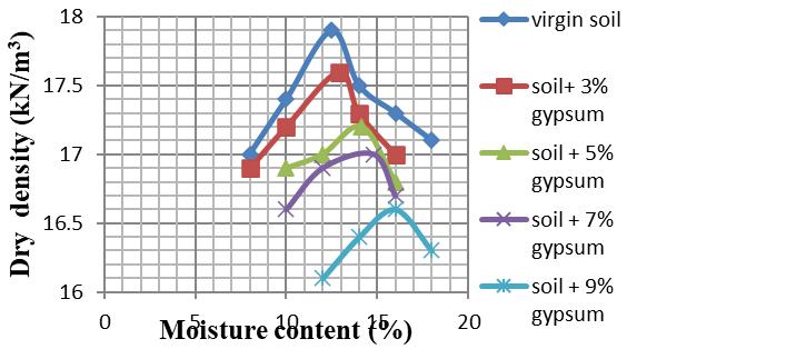 Gypsumreducesthemaximumdrydensitywhileincreasing the soil's optimum moisture content up to a specified admixturecontent%.Thedecreaseindrydensityisbrought onbysoilparticleflocculation.Thesoilgetslooserandmore challengingtocompress.Whiletheadditionoffinerparticles likesgypsumincreasedthesoil'ssurfacearea,whichinturn improved the optimal moisture content. More water is neededtomoistensoilparticleswithgreatersurfaceareas.