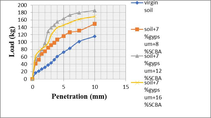 AdditionofgypsumresultedinincreaseOMCanda declineincompressibilityvalueintermsoftheMDD parameter, OMC of virgin soil is 12.5% and MDD 17.9kN/m3,withadditionofgypsumandSCBAthe value of OMC increases while MDD decreases considerably. The change in soil matrix, which showsamorerandomlyflocculatedstructuredueto the presence of CaO in SCBA and the addition of gypsumcontent,mayberesponsiblefortherisein moisturecontent.