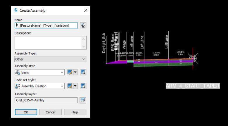Purposeofassemblyistodefinecrosssectionalplatform for the designed alignemnet in Civil 3D Software. ‘Subassembly’ is a part of assembly. Assembly includes subassemblies such as shoulder, hardstrip, median, verge, carriagewaylaneforcreatingtypicalcrosssectionofroad. Thesesubassembliescanbeaddedtoeitheronlyrightorleft side of center of cross section or both side as per the requirement.