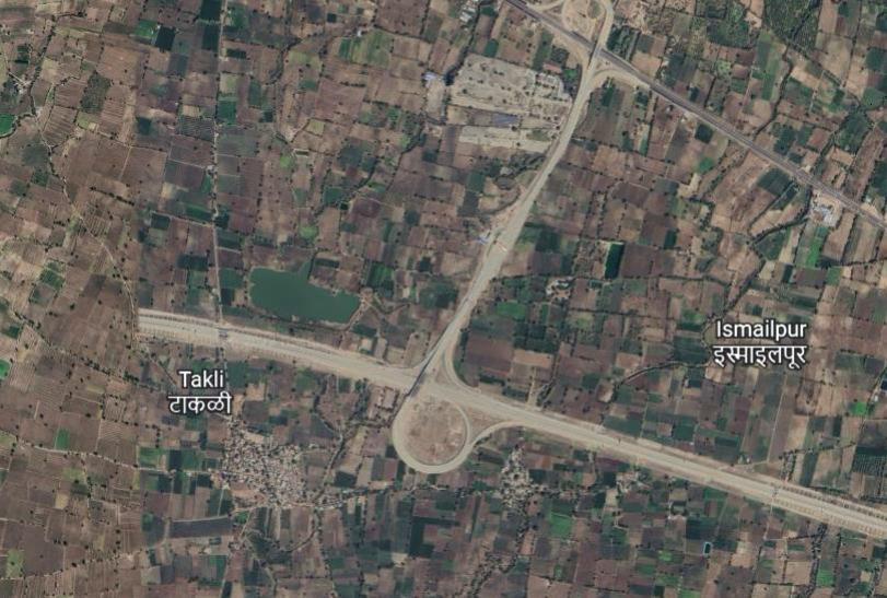 The selected interchange is a trumpet interchange which consists of total 4 ramps i.e., 2 directional ramps, 1 semi directionalrampand1loopramp.ThisinterchangeisatCH 447+064,alsocalledasDhulebypassandconnectstoNH52.