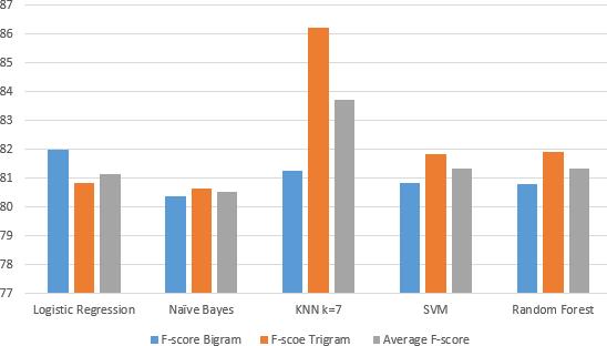 Similarly, Table V summarizes the recall, precision, and f1-score in the presence of the extracted features behaviors of the users in the two language models. It is found that, the highest f1-score value is achieved by Logistic regressionwithf1-scorevalueof82%incaseof Bi-gram. While the highest f1-score value in Tri-gram is achieved in KNN with f1-score value of 86.20%. Fig. 5 illustrates the performance of all classifiers.The KNN classifier outperforms all classifiers in terms of the overall average f1-score with value of 83.73%.