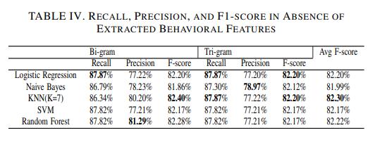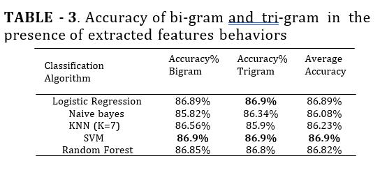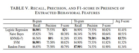 performance measure inaddition to accuracy. 70% of the dataset is used for training while30% is usedfortesting. The classifiers are first evaluated in the absence of extracted features behaviors of users and then in the presence of the extracted behaviors. In each case, we compare the performance of classifiers in Bi-gram and Tri-gram language models.
