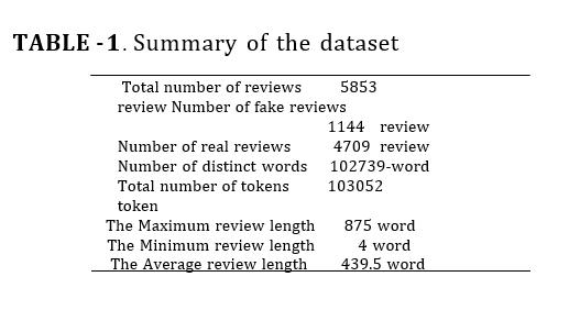 We evaluated our proposed device on Yelp dataset [5]. This dataset consists of 5853 opinions of 201 inns in Chicago written with the aid of 38, sixty-three reviewers. The evaluations are categorized into 4, 709 assessments labeled as actual and 1, a hundred and forty-four opinions labeledasfake.Yelphascategorizedtheopinionsintoactual and fake. Each occasion of the evaluate in the dataset consists of the evaluation date, evaluation ID, reviewer ID, product ID, evaluation label and megastar rating. The