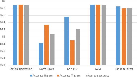Ontheotherhand,TableIIIsummarizestheaccuracyof theclassifiers in the presence of the extracted features behaviorsof the users in the two language models. The results revealthat the classifiers that give the highest accuracy in Bi-gramis SVM with score of 86.9%. Logistic regression and Random Forest have relativity close accuracy with score of 86.89% and 86.85%, respectively. While in Tri-gram model, both SVM, and logistic regression give the best accuracy with score of 86.9%. The Random Forest gives a close score of 86.8%. The summary of the results is illustrated in Fig. 3. Also, it isfoundthatthehighestaverageaccuracyisobtainedwith SVMclassifier with score of 86.9%.