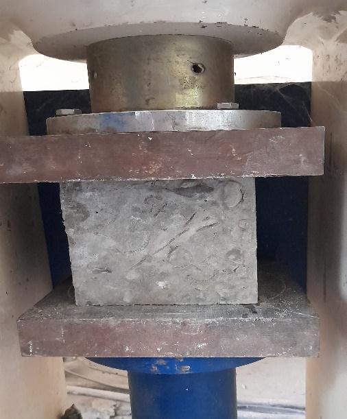 Concrete mix was prepared as per IS 10262:2019 [9] with the w/c ratio of 0.39 using M35 grade of concrete. Toinvestigatetheoptimumdosageofm-sand,specimens were prepared with varying dosage of m-sand. Cubes of 150mm3 were casted for compressive test. As per previous literature abrasion resistance was increased with lower w/c ratio and increased characteristic strength of concrete. So, it is considered that specimen with high compressive strength may show better abrasion resistance. So, the optimization of all admixtures was done on the compressive strength viewpoint. Five specimens with 15%, 30%, 45%, 60%, 75%ofm-sandwereprepared alongwith a specimenof conventional concrete. Compressive test was performed using CTM with cubical specimens of 150mm3 as per IS516:1959. After optimization of m-sand, steel fibre at therateof0.5,0.75,1.0and1.25percentbyvolumewas usedtocastnewspecimenswithoptimumcontentofmsand that is 60 percent. And for optimization of polypropylene fibre content, cubes for compressive test were casted with 0.5kg/m3, 1.0kg/m3, 1.5kg/m3 , 2.0kg/m3 with 60 percent m-sand. After optimizing all admixtures content, cubes of 70.6mm3 were casted for abrasion test. The abrasion test was performed on abrasion testing machine as per IS 1706:1972. First fix the specimen in the holding device and abrasive dust (corundum aluminium Oxide Al2O3) of 20 ± 0.5 g was spread over the disc. Total 220 revolution was made in 10 parts with 22 revolutions in each. Abrasion testing setupshowninfigure4.