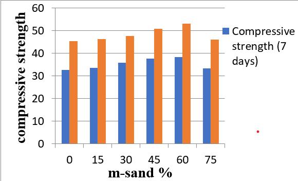 Concrete shows better compressive strength with 60% m-sand as fine aggregate. Compressive strength increased by 16 percent with 60 percent m-sand as showninfigure5