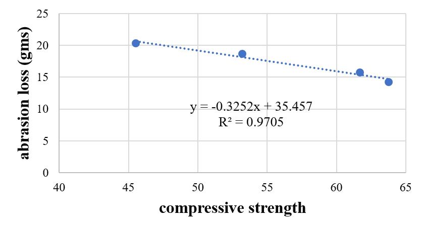 Abrasion resistance of concrete have strong relation with compressive strength. As per regression analysis, it shows abrasion loss decreaseswithincreasingcompressivestrength.