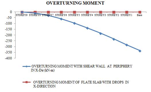 The graph demonstrates the overturning moment in horizontal plane is on the structure as a whole resulting from the dynamic earthquake forces. The overturning moment with negative value depicts the counter balancing the seismic disturbanceresultsinmorestabilityforshearwallatperipheryascomparedtoflatslabwithdrop,thusmodel1ismuch stableascomparedtomodel2.