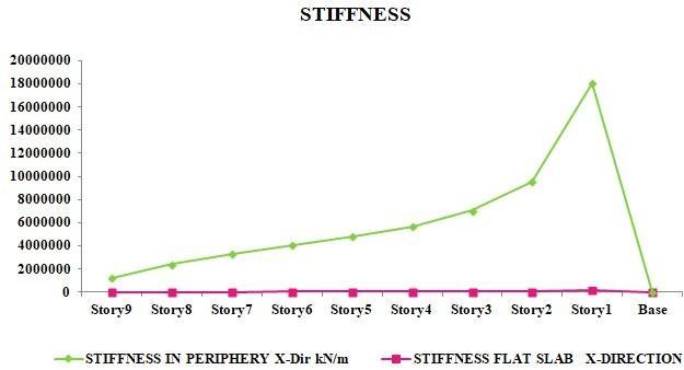 ThestiffnessofmodelwithshearwallatFlatslabshowslowerstabilityascomparedtomodelwithatperiphery.ThusAt peripheryprovidesmorestabilitytobuildingunderlateralloads.