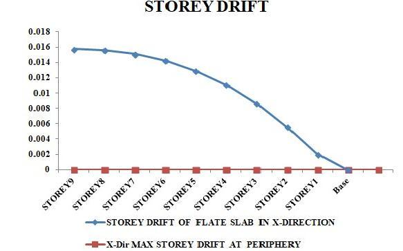 The building with flat slab with drop has storey drift is 0.015752 m whereas in building with shear wall at periphery storey is 1.31E-07 m both are in max permissible limit is 0.192 m. Hence our building is safe, in y as a well as in x direction,driftvaluesareunderpermissiblelimitaccordingtoIS1893.