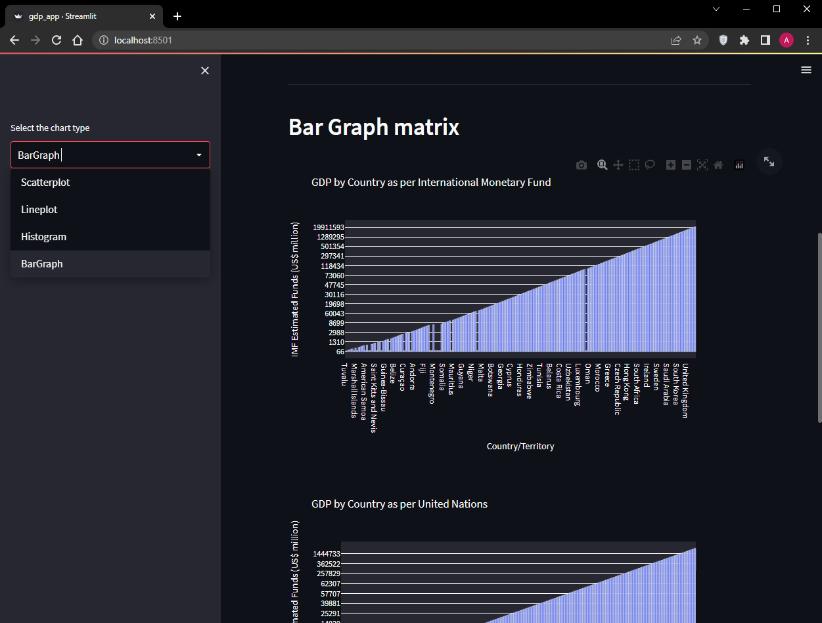 Streamlitisanopen-sourcePythonlibraryforcreatingand sharing beautiful, unique web applications for Artificial IntelligenceandDataScience.Here,weusedthislibraryto createawebapplicationtoanalysetheGDPofcountriesover a specifiedtime frame prior to and following the Corona virus epidemic. This module seamlessly incorporates website functions while supporting Python. The speed of network deployment was accelerated by Streamlit's simplicityoffrontendandbackendoperations.