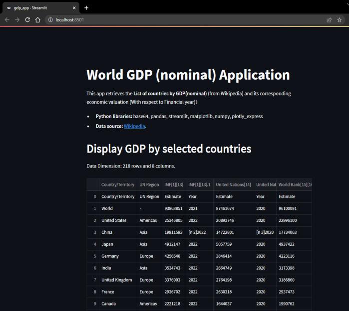 The term "web scraping" refers to the process of using a computerorpieceofcodetoextractandmanagealotofdata from the internet. We used the popular Python package "pandas" in this study since it is well known for handling structureddatainavarietyofformats,includingarrays,lists, URLs, CSV files, and more. This library provides data extractionforhtml retrieval usingURL fromopenservers likeWikipedia,datamart,etc.Inasimilarmanner,weused anhtmltablescrapingtechniqueusingproperindexingand a python data frame to implement the GDP of countries (nominal)databasefromWikipediaforthisresearch.