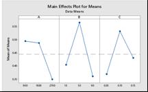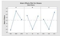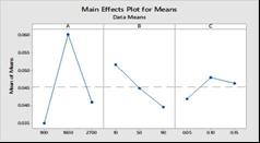 Fig.4 showsthemaineffectplotforMRR.Thetrendobserved for feed rate is increasing MRR increases. According to ANOVA (Table 6.), the most significant factor observed is Feed Rate. According to MRR, the formula of Q is directly proportionaltothedepthofcut,thewidthofthechannel,and Feed.Thus,thevalueofMRRriseswithriseinfeedrateand depth of cut. Optimum set is Feed=90mm/min, Depth of Cut=0.15mm,Speed=900rpm