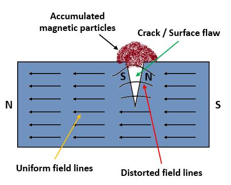Itisusedfordetectionofsurfaceandnear-surfaceflawsin ferromagnetic materials and is primarily used for crack detection.Theworkpieceismagnetizedandthemagnetic fluxispresentpredominantlyinsidethematerial.Ifthereis anysurfacebreakingflaw,themagneticfieldisdistorted, causing local magnetic flux leakage around the flaw. This leakagefluxisdisplayedbycoveringthesurfacewithvery fine iron particles suspended in diesel. The particles accumulateattheregionsoffluxleakage,producingabuildupwhichcanbeseenvisuallyevenifthecrackisverysmall and narrow. Thus, a crack is indicated as a visible line of ironpowderormagneticparticlesonthesurface.