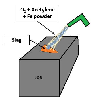 Gas cutting: Mixture of oxygen and Acetylene is used to preheatthemetaltoitsignitiontemperature(forsteel,700900 degree Celsius) but below its melting point. A jet of oxygen is directed into the preheated area initiating a vigorousexothermicchemicalreactionbetweenthemetal and oxygen to form a metal oxide or slag. The oxygen jet blowsawaytheslagenablingthejettopiercethroughthe material and continue to cut through it. Ignition temperatureofthematerialmustbelowerthanitsmelting point otherwise, the material would melt and flow away before cutting. Oxide melting point should be lower than that of the surrounding material so that it can be mechanically blown away by the oxygen jet. Oxidation reaction between the oxygen jet and metal must be sufficienttomaintaintheignitiontemperature.Minimum gaseous reaction products should be formed so as not to dilutethecuttingoxygen.