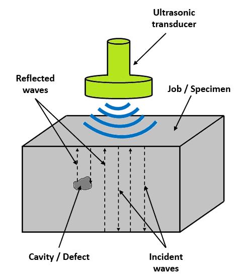 This method uses high frequency sound waves to detect surface and subsurface discontinuities in castings. It can alsomeasurethethicknessofthecastingatlocationswhere thehumanhandormechanicaldevicescannotreach.Here, anultrasonictransducertransformselectricalenergyinto mechanicalenergyintheformofsoundpressurewavesand thesoundpulsethus,generatedinitiatesatthetransducer, travelsthroughthecastingandisreflectedbyboththeback wall of the casting and any discontinuities that may be present. The transducer senses the reflected sound wave andconvertsittoanelectricalsignal.Thepropertiesofthe soundwaveliketransittime,amplitudeandshapegivean ideaaboutanydefectspresent.
