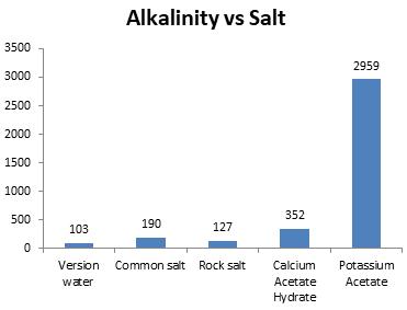 Safe value of alkalinity of water is 20 to 200 ppm. Asdifferentsalts were applied to meltice, NaCl and Rock salt sustained the esteemed range.