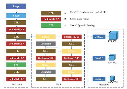 Inaddition, basedonthe FPNstructure,YOLOv5addsa bottom-upfeaturepyramidstructure.TheFPNlayersends powerful semantic characteristics from top to bottom, whereas the feature pyramid conveys robust positional features from the bottom up, thanks to this combination operation.To boostthe network’sabilitytodetecttargets at different scales, use feature aggregation from several featurelayers.Outputthecategorizationresultsandobject coordinates at the bottom of the figure. We used the opensource version of YOLOv5 by ultralytics[17]. This contains different models that have been pre trained on