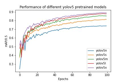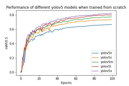 Model Best mAP/0.5 after 100 epochs yolov5n 0.66436 yolov5s 0.73315 yolov5m 0.77113 yolov5l 0.79944 yolov5x 0.82100