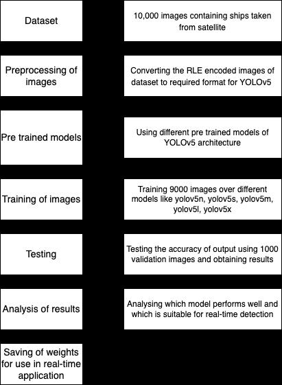 As shown in fig -1, the preprocessing step involves processing the imageso thatitcan be fedasinput forthe training process. The images in the dataset come along withRLEencodedstringsthatindicatepixelswhereships are present in an image. This can be used for training by converting RLE encoded string to binary masks for input for training on image segmentation models and by converting them to YOLO annotation format in a text file fortrainingonYOLOv5objectdetectionmodel.