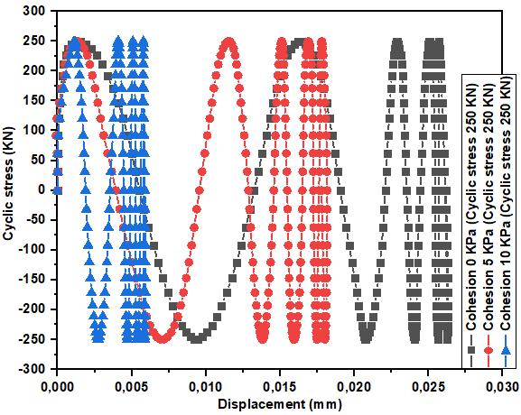 The cyclic lateral displacement decreases with increasing cohesion(Fig.6a).Fig.6bshowsthedecreaseincyclicstressdisplacementasafunctionofcohesionchange.