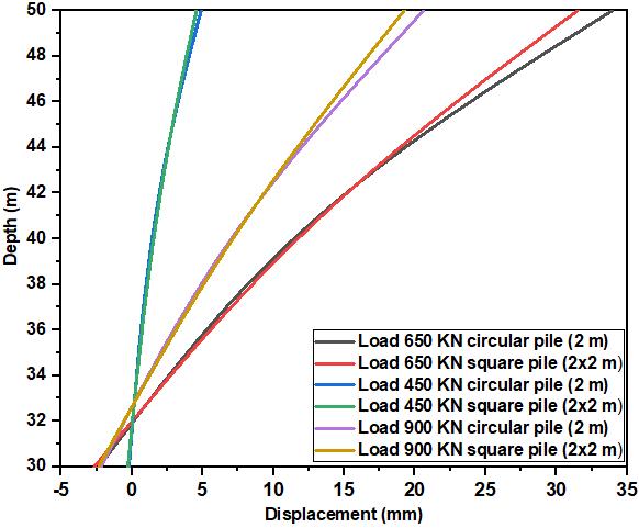 Fig.(1a)showstheevolutionofthelateraldeformationsatthe pilehead,includingthegeometricshapesunderstaticlateral loading(preandpost)cyclicinthesand.Itcanbeseenthat themaximumdisplacementsareinthevicinityofpilehead andthendecreasewithdepth,thisisvalidforbothgeometric shapes.Thecircularpilehasadisplacementof33.96mmfor aloadof650KN,whichisgreaterthanthesquarepile31.50 mm,thatisadifferenceindeformationofabout7.23%.The final static lateral load of 450 KN, gives a difference in displacementbetweenthetwotypesofcircularandsquare pilesoftheorderof4.88mmand44.55mmrespectively,a difference of 6.76%. The same phenomenon is observed whenthestaticloadisincreasedto900KN.Inthiscase,the deformationbetweenthecircularandsquarepileshapesisof the order of 20.61 mm and 19.24 mm respectively, a differenceof6.64%.Itcanbeconcludedthatthesquarepile hasgoodresistancetocycliclateralload(beforeandafter) due to the interlocking action with the surrounding soil, unlikethecircularpile.