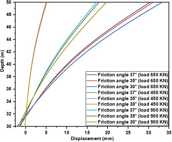 Fig.7ashowsalargelateraldisplacementforthe30°angle under monotonic cyclic lateral loading (before and after). Thus,understaticlateralloading,thelateraldisplacementas afunctionofthe30°angleis33.20mm,andthedisplacement decreases with increasing friction angle. By increasing the frictionanglefrom35°to37°,adeformationatthepilehead intherangeof31.08mmto30.29mmisobserved.