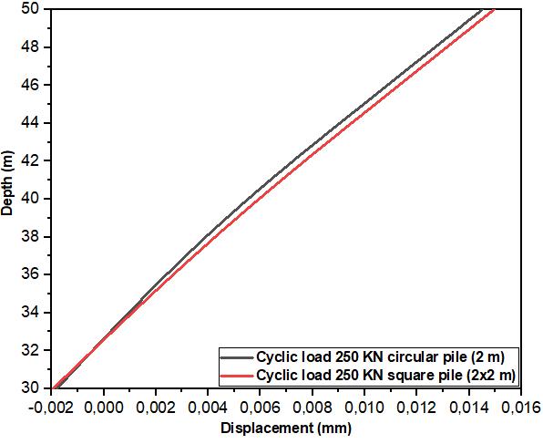 Fig.(1c)showstheinfluenceoftwogeometricshapesona pileinsandundercycliclateralloading.ThecurvesinFig.(1c) showaslightdifferenceinlateraldeformationbetweenthe squarepileandthecircularpileatthehead.Thesquarepile hasasmallerlateraldisplacementof0.0149mmwhilethatof thecircularpileis0.0144mmunderacyclicloadof250KN andastaticloadof650KN,dependingonthechangeinradial stresses in the soil. Thus, the difference is of the order of 6.04%.