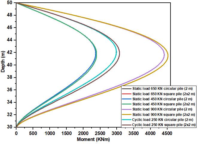 Fig.(1b) shows the evolution of pile moments for both geometric shapes. The observed results illustrate that the bending moments developed in the square piles are more pronouncedthanthemomentsfoundinthecircularshaped piles, both under static lateral loading and under cyclic loading, the effect of cycling on the maximum moment is small [13-14], the differenceis3.02% foran initial loadof 650KN,aswellasinthecaseofcyclicloading.