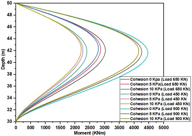 Themomentschangewiththevariationofcohesion;alarge momentisobservedwithanequalcohesionof0KPaandthe smallestwithacohesionof10KPa.Thecohesiontherefore hasasignificantinfluenceonthebehaviouroftheisolated