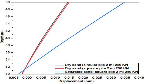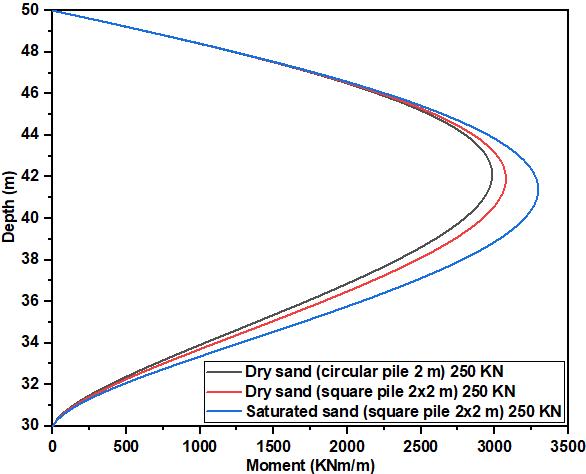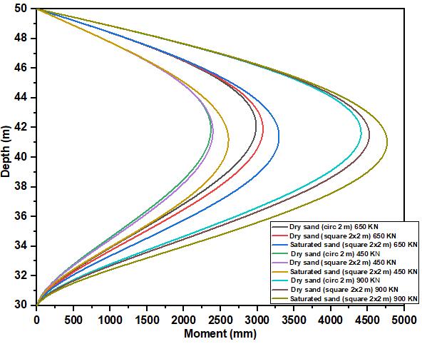 Fig.3ashowsthedifference indisplacementofthecircular pile of 0.0144 mm and the square pile of 0.0149 mm, all drilledindrysandcomparedtothecurveofthesquarepile of 0.0347 mm in saturated sand under post-static cyclic loading.Thedifferenceindisplacementbetweenthecircular pileandthesquarepileinsaturatedsandis58.50%.Fig.3b shows the evolution of the bending moments in dry, saturatedsoilasafunctionofgeometricshape.