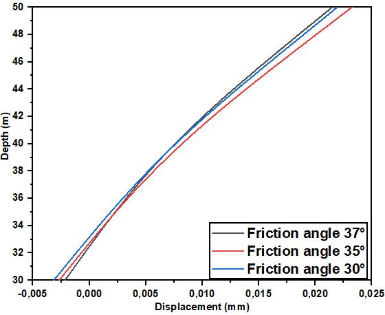For a change in cohesion of 0 KPa, 5 KPa and 10 KPa, the lateral displacement decreasesby0.0269 mm,0.0184 mm and0.00624mmrespectively,adifferenceof76.80%.