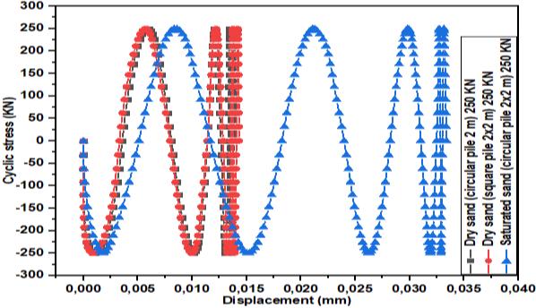 Fig.4 shows the cyclic stress-displacement behavior. The square pile in the saturated condition has a large cyclic displacementof0.0333mm,comparedtothecircularand squarepilesindrysoilwhichhavedisplacementsof0.0140 mm and 0.0143 mm respectively. The difference between thesquarepileinsaturatedsandandthecircularpileindry sandis57.95%.